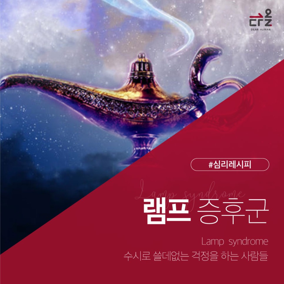 동화 〈알라딘과 요술램프〉에서 유래. <알라딘과 요술램프>는 우리가 흔히 알고 있는 디즈니 ‘알라딘’의 내용이 아닌 중동의 민화들로 구성된 설화집 《천일야화》에 실린 이야기 중 하나입니다. 한 마법사가 알라딘을 꾀어내 동굴 속에 있는 낡은 램프를 대신 가져 오라고 시키게 되죠. 램프를 손에 넣은 알라딘이 마법사와의 실랑이 끝에 동굴을 탈출하게 됩니다. 알라딘은 낡은 램프를 어머니에게 맡기게 되고, 어머니가 램프를 닦자 소원을 들어주는 요정이 나타나게 됩니다. 바로 이 램프의 요정 덕분에 공주와 결혼까지 할 수 있었다는 이야기입니다. 이 이야기의 유래로 램프 증후군은 현대에 이르러 알라딘이 램프의 요정을 불러내듯이 근심, 걱정을 불러내 스스로를 괴롭히는 현상을 지칭하게 되었습니다.